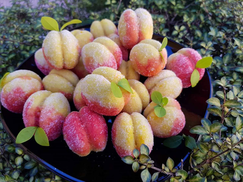 După ce au fost colorate piersicile, se lasă 5 minute să se zvânte, pe un prosop de bucătărie, apoi se dau prin zahăr.