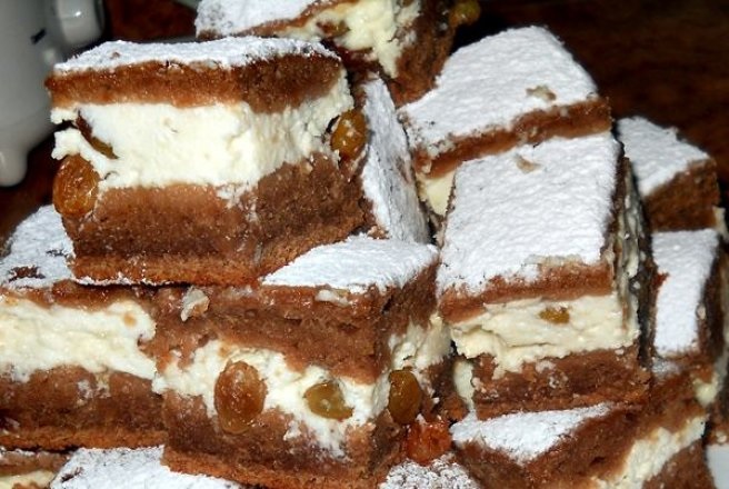 Blat: se bat albușurile spumă cu un praf de sare și zahărul până devine o bezea lucioasă. Apoi se adăugă treptat câte un gălbenuș, uleiul, laptele, zahărul vanilinat, coaja de portocală și cacaua amestecată cu făina și praful de copt cernute. Se tapetează o tavă cu hârtie de copt, se adaugă jumătate din aluat și se bagă la cuptor până se întărește puțin (5-10 min depinde de cuptor). Între timp se prepară compoziția de brânză. Se amestecă brânza cu coaja de lămâie, grisul, stafidele și gălbenușurile. Albușurile se mixează cu un praf de sare, zahărul și zahărul vanilinat și se adaugă peste brânză. Se omogenizează totul bine. Se scoate tava de la cuptor, se adaugă brânza peste blatul puțin întărit, apoi se toarnă cealaltă jumătate din aluat și se introduce din nou la cuptor pentru 30-35 de minute (se face testul scobitorii). Se lasă prăjitura la răcit și se pudrează cu zahăr pudră.