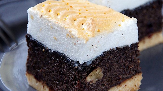 Într-un vas, se amestecă făina împreună cu praful de copt și zahărul pudră. Separat, se mixează gălbenușurile cu untul. Se încorporează cele două compoziții. Se toarnă aluatul obținut într-o formă tapetată cu hârtie de copt cu dimensiunea de 35 x 25 cm. Blatul se coace la cuptorul preîncălzit la 180° C timp de 15 – 20 minute. Între timp, se pregătește umplutura cu mac. Se amestecă zahărul împreună cu nucile tocate. Se adaugă untul moale, esența de migdale, grisul și gălbenușurile. Se mixează separat albușurile, apoi se încorporează la umplutură. Se adaugă semințele de mac și se amestecă cu o lingură de lemn sau spatulă. Se distribuie umplutura pe blatul copt și răcit. Se coace la cuptorul preîncălzit la 175° C timp de 35 – 45 minute. Pentru bezea, se mixează albușurile și treptat se adaugă zahărul. Se distribuie bezeaua peste umplutura cu mac. Se lasă prăjitura la cuptorul preîncălzit la 150-160 pentru încă 15 minute.