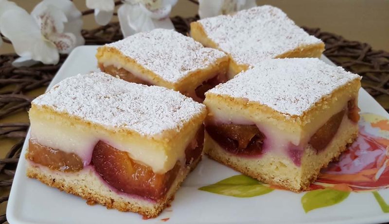 Albușurile se bat spumă. Se adaugă apoi alternativ zahărul și apa clocotită și se bat în continuare până se topește zahărul. Se adaugă uleiul și gălbenușurile, apoi se lasă mixerul deoparte și se adaugă făina amestecată cu praful de copt și coaja rasă de lămâie. Se amestecă ușor cu o lingură de lemn, de jos în sus până se omogenizează, apoi se toarnă 2/3 din compoziție într-o tavă (20/30) tapetată cu hârtie de copt. Restul de compoziție se amestecă cu cacao, apoi se toarnă deasupra. Se pun prunele tăiate în sferturi și piersica în cubulețe și se pune tava în cuptorul preîncălzit, la foc mic timp de 35 minute.