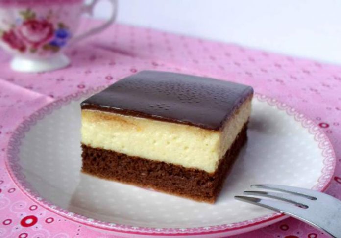 Pentru început se separă albșurile de gălbenușuri.Într-un bol, se mixează ingredientele uscate pentru stratul de jos (făină, cacao și praf de copt). Separat, se mixează albușurile cu un praf de sare. Într-un alt bol, se amestecă zahărul împreună cu gălbenușurile, apoi se adaugă compoziția de albușuri bătută spumă. Se încorporează amestecul de ingrediente uscate, iar în final se adaugă patru linguri de apă și se mixează bine până la omogenizare. Se toarnă compoziția obținută într-o tavă cu dimensiunile de 30×20 cm unsă cu unt și tapetată cu făină sau hârtie de copt. Se coace la cuptorul preîncălzit la 180° C pentru 20 de minute. Când este gata se poate însiropa cu puțin lapte.