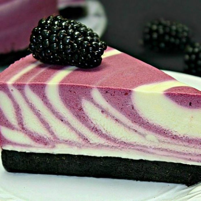 Se mărunțesc biscuiții Oreo cu ajutorul unui robot de bucătărie. Se transferă conținutul într-un bol, adică pesmetul de biscuiți Oreo și se adaugă untul topit, după care se amestecă totul. Acesta va fi primul strat al acestei prăjituri, care va fi pus într-o tavă rotundă cu diametrul de 22 de cm. Tava va fi tapetată pe margine cu folie de acetat, iar fundul tăvii este tapetat cu hârtie de copt. Se pune în tavă baza de biscuiți cu unt și se distribuie amestecul pe toată suprafața, după care se presează ușor și se nivelează. Se pune tava la frigider pentru a pregăti cele două creme.Se hidratează gelatina împărțind cantitatea de apă în cele două boluri. Se amestecă după care se lasă bolurile deoparte. Se păstrează câteva mure pentru decor, iar restul se pasează cu ajutorul unui blender. Se strecoară sosul de semințe cu ajutorul unei site, după care se bate smântâna pentru frișcă. Se adaugă zahărul pudră când frișca este bătută mai mult de jumătate și se mixează în continuare până când devine fermă și se împarte aproximativ egal în 2 boluri. Se lasă frișca deoparte și se bagă gelatina în cuptorul cu microunde pentru 15 secunde. Se scot bolurile și se amestecă după care este nevoie de iaurt și sosul de mure. Se adaugă primul bol cu gelatină în iaurt și se amestecă până la omogenizare. Se adaugă a doua parte de gelatină în sosul de mure și se amestecă. Se toarnă sosul pentru prima parte de frișcă și se amestecă pentru a le combina. Se trece la cealaltă parte de frișcă în care se pune iaurtul cu gelatina. Se scoate tava de la frigider și se adaugă intercalat din cele două compoziții. Se începe cu crema de iaurt și se pune puțin din aceasta în centru, după care puțin din crema cu mure. Se încearcă să se adauge cantități aproximativ egale și se alternează cele două creme până când se vor termina. Se pune tava la frigider pentru aproximativ 6 ore. Se scoate prăjitura de la frigider și se decorează cu murele păstrate.