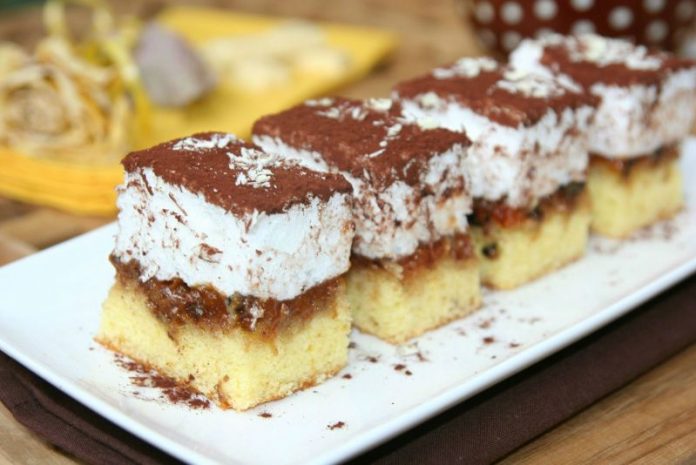 După 15 minute de copt se scoate tava din cuptor și se lasă circa 5 minute să se răcească. Peste blat se întinde uniform un strat de gem. Peste gem se întinde cu grijă bezeaua cu nucă, se nivelează cu o spatulă, se cerne uniform peste bezea zahărul pudră și se pune prăjitura la cuptor la 150˚ pentru circa 20 de minute. Când bezeaua este colorată ușor la suprafață înseamnă că este gata și este suficient de coaptă. Se lasă prăjitura să se răcească și se porționeaza după dorința fiecăruia.