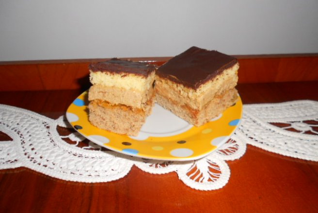 Blatul colorat: se bat separat albușurile de gălbenușuri adăugând zahărul în trei reprize, apoi se freacă gălbenușurile cu uleiul și se amestecă cu celelalte ingrediente. Se tapetează tava de aragaz cu hârtie de copt și se toarnă compoziția obținută. Se coace 35-40 minute.Cât timp se coace blatul, se prepară compoziția pentru al doilea blat urmând același procedeu; se coace 30 minute. Blatul alb trebuie copt într-o tavă de aceeași dimensiune cu cea în care am copt blatul colorat, deoarece se suprapun.Se caramelizează zahărul pentru a obține caramelul, iar la sfârșit se adaugă untul; se toarnă repede peste blatul colorat și se întinde cât se poate de repede.Se lasă la răcit blaturile și se trece la prepararea cremei; se pun într-un vas ouăle, zahărul, laptele și budinca caramel; se fierbe până se îngroașă, se amestecă mereu cu telul să nu se prindă crema, apoi se lasă crema să se răcească.Până se răcește crema, se freacă untul cu 7 linguri de zahăr pudră și cu nessul, se adaugă apoi câte o lingură din crema răcită până se încorporează totul. Se întinde crema peste blatul cu caramel, se așează blatul alb, iar peste blat glazura de ciocolată.