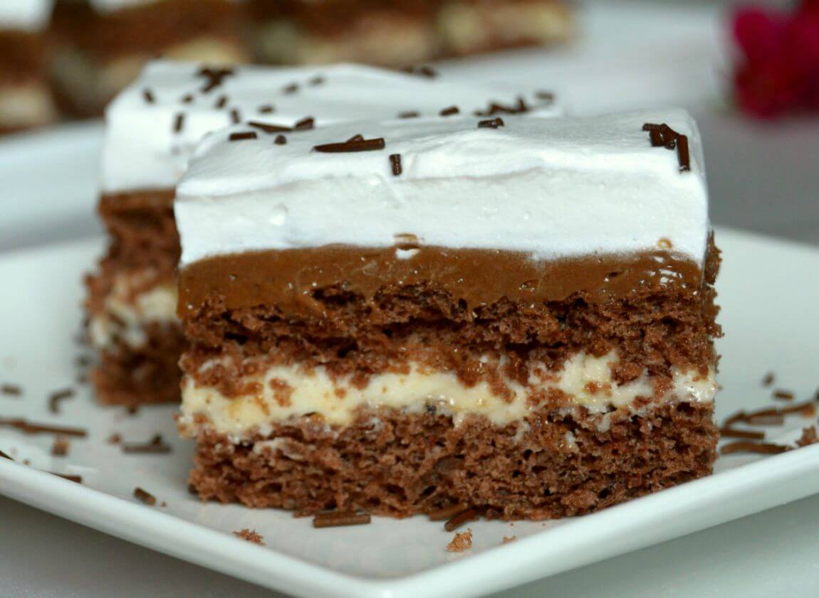 Se decorează prăjitura cu nucă de cocos și se pune la frigider pentru câteva ore sau chiar peste noapte, cât să se solidifice crema.