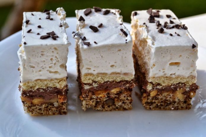 Mai întâi se pune nuca într-o tavă și se pune la cuptor pentru a se coace puțin, după care se macină să iasă cam 7 linguri, iar restul se rupe cu mâna în bucăți mai mici. Se unge o tavă cu margarină, se pune nuca prăjită atât cât să acopere toată suprafața. Se separă albușurile de gălbenușuri. Cele 7 albușuri se bat bine cu 7 linguri de zahăr, se adaugă 7 linguri de nucă măcinată, 3 de făină și praful de copt. După ce compoziția este omogenizată se toarnă în tavă peste nuca și se dă la cuptor la 180 de grade, până trece testul cu scobitoarea(cam 20-30 de min). Se scoate din cuptor când este gata. După ce s-a copt se răstoarnă pe un platou dreptunghiular, nuca trebuie să fie deasupra. Se pune peste crema de fineti, apoi se așează biscuiții înmuiați un pic în cafea. Cele 7 gălbenușuri se amestecă cu 7 linguri de zahăr și se pun la baie de aburi, amestecând bine până se îngroașă puțin. Se lasă la răcit după care se amestecă cu frișca bătută bine. Compoziția obținută se pune peste biscuiți și se ornează cu cacao.Se porționează după preferință.