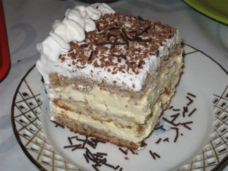 Se pune o foaie din blatul tăiat în două, un strat de cremă, blatul de bezea, un strat de cremă și cealaltă parte de blat. Se întinde crema de brânză peste prăjitură și se răzuiește ciocolată. Se lasă prăjitura peste noapte la frigider sau cel puțin 3 ore înainte de a fi consumată.