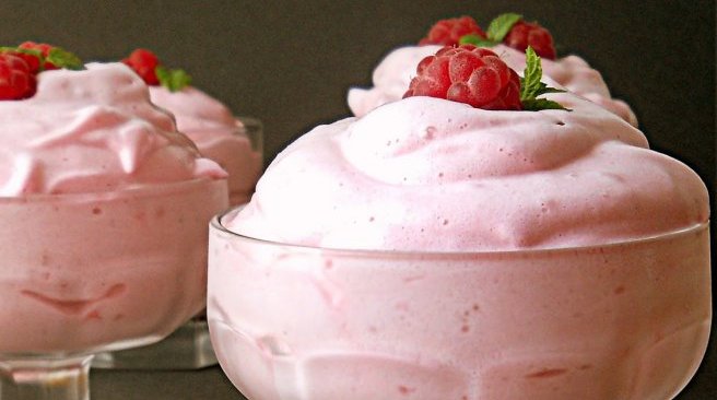 Se sparg și se separă ouăle. Se bat albușurile cu 4 linguri de zahăr până ce se obține o spumă consistentă, ca la bezele. Se spală zmeura și se adaugă peste spuma de ouă. Se adaugă plicul de zahăr vanilinat și se mixează foarte bine compoziţia. Apoi, se lasă la frigider pentru o oră sau două.