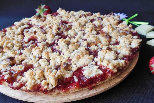 Tapetăm o tavă pentru tartă cu hârtie de copt, luăm 3/4 din aluat și îl presăm cu mâna în tavă. Turnăm umplutura peste, o nivelăm, apoi presărăm restul de aluat. Ciocolata o tăiem cubulețe și o punem deasupra. Introducem tarta în cuptorul încins, la o temperatură potrivită, până când aluatul de deasupra devine auriu. După ce prăjitura s-a răcit complet, desfacem marginile formei detașabile, transferăm desertul pe o farfurie și tăiem în felii.