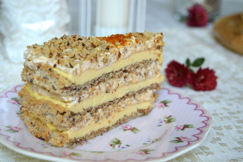 6 ouă, 6 linguri de zahăr pudră, 3 ½ linguri de făină, 250 gr de nuci măcinate, 200 gr de unt, esenţă de vanilie, 350 ml de lapte, 200 ml de frişcă, 200 gr de zahăr tos