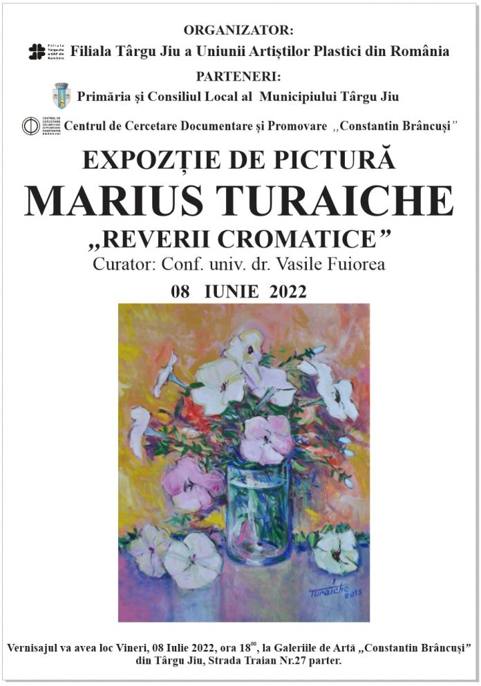 Filiala Târgu Jiu a Uniunii Artiștilor Plastici din România, în parteneriat cu Primăria Municipiului Târgu Jiu și Centrul de Cercetare Documentare și Promovare „Constantin Brâncuși”, organizează vineri, 8 iulie, ora 18.00, la Galeriile de Artă „Constantin Brâncuși” din Târgu Jiu, strada Traian nr. 27, parter, vernisajul expoziției personale de pictură „Reverii cromatice”, a artistului Marius Turaiche, membru al UAP din România, Filiala Craiova.