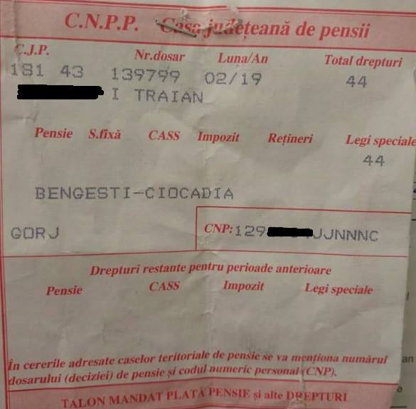 44 de lei! Atât e venitul lunar al lui nea Traian. Adică 1,5 lei pe zi. O pâine! Banii reprezintă o compensație pentru cele nouă luni muncite în vremea cât a fost militar. Cam 5 lei pentru fiecare lună lucrată. ,,Nu are pensie, are numai o indemnizație, pe o lege specială, pentru detașamentele speciale de muncă. Adică, la timpul armatei a făcut parte dintr-un detașament special care desfășura munci grele. Se plătește o indemnizație de 5 lei pentru fiecare lună lucrată și se actualizează în acest an…”, au precizat reprezentanții Casei Județene de Pensii Gorj.După intervenția chirurgicală, nea Traian e în convalescență, dar nu mai poate munci. A avut probleme cu hernia. Nu-i mai rămâne decât să aștepte actualizarea indemnizației. Poate i se mai adaugă câțiva lei în plus. Altă opțiune nu există. Anul trecut, cei de la AJPIS i-au tăiat și ajutorul social. Are 40 de ari de teren, cu 20 mai mult decât permitea legea pentru a încasa așa numitul venit minim garantat de 140 de lei.