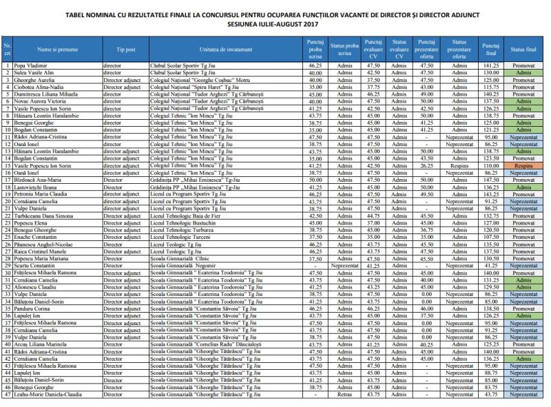 director și 20 de director adjunct. ”Conform metodologiei, suntem obligați, cel târziu pe 2 august, să facem publice rezultatele finale validate ale concursului”, a mai declarat Georgeta Popescu, purtătorul de cuvânt al ISJ Gorj. Cei șase candidați care au formulat contestație, după ce au participat la concursul pentru ocuparea posturilor vacante de director şi director adjunct din unităţile din învăţământul preuniversitar, nu au primit vestea pe care o așteptau. ”Nu s-a schimbat situația inițială, în urma contestațiilor”, a declarat Georgeta Popescu, purtătorul de cuvânt al Inspectoratului Școlar Județean Gorj. În total, 61 de persoane s-au înscris în competiţie, fiind declarat “promovat” candidatul “admis” care a obţinut cel mai mare punctaj total. Acestea au formulat 86 de opțiuni, la mai multe școli, fiind vacante 32 de posturi de director și 20 de director adjunct. ”Conform metodologiei, suntem obligați, cel târziu pe 2 august, să facem publice rezultatele finale validate ale concursului”, a mai declarat Georgeta Popescu, purtătorul de cuvânt al ISJ Gorj.