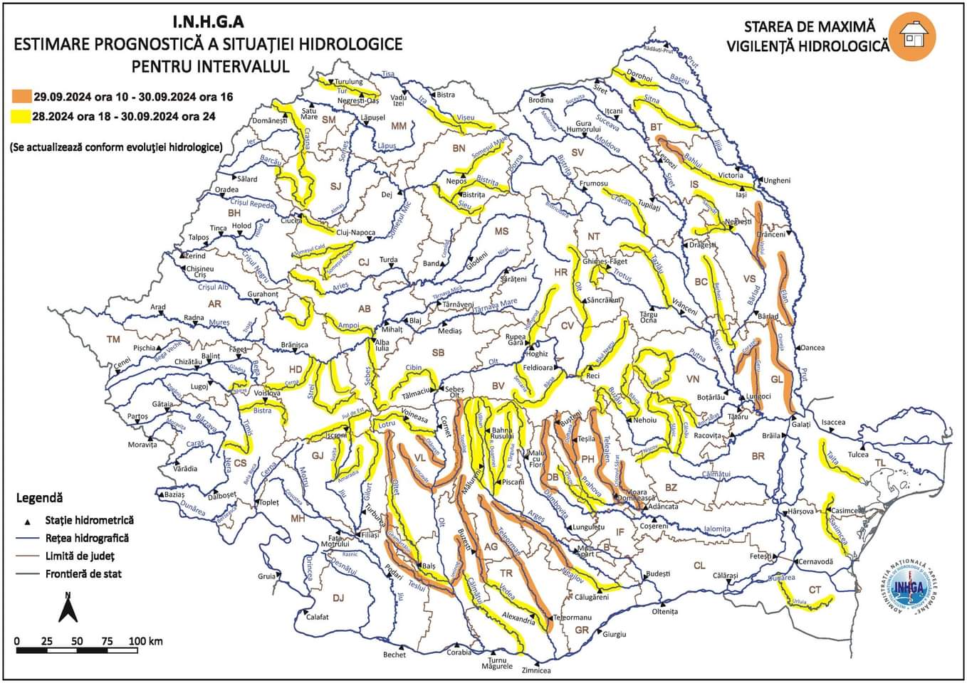Conform situaţiei hidrometeorologice actuale şi prognozei meteorologice pentru următoarele 72 de ore, INHGA a emis Codul Portocaliu, care va intra în vigoare începând de duminică, de la ora 10:00 și va fi valabil până luni, la ora 16:00. Acesta va afecta râuri din județele: Vâlcea, Gorj, Argeș, Olt, Dolj, Teleorman, Dâmbovița, Giurgiu, Ilfov, Prahova și Ialomița. Același cod va fi activ și în intervalul 29 septembrie, ora 22:00 – 30 septembrie, ora 16:00, pe râuri din județele: Vaslui, Iași și Galați.