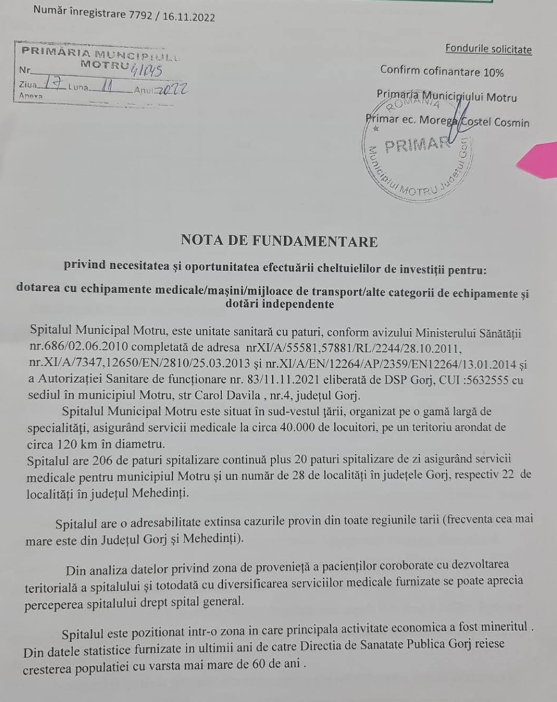 Primarul Cosmin Morega, în urma discuției purtate cu managerul spitalului din localitatea Motru, Alin Efrim, cu privire la echipamentele medicale necesare desfășurării actului medical corespunzător, a solicitat demararea procedurilor pentru achiziția unui RMN și a altor echipamente medicale pentru unitatea spitalicească. În acest sens, deja s-a înaintat nota de fundamentare din partea spitalului către primăria municipiului, aceasta fiind aprobată și urmând ca sumele solicitate sa fie aprobate și de Ministerul Sănătății, Primăria Motru fiind de acord sa suporte cota de finanțare pentru a putea achiziționa, cât mai urgent, un astfel de aparat. La ora actuala este in faza de licitație, achiziția unui aparat de radiologie modern, cu o valoare de 1,2 mil.lei, iar acest RMN, dorit de autorități, este benefic pentru cetățenii obligați să parcurgă zeci de kilometri pentru un astfel de consult sau să aștepte pe lungi liste de așteptare.