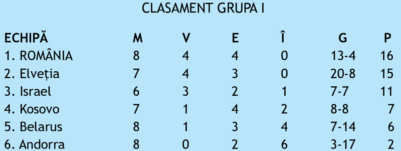 România mai are de disputat două partide în Grupa I, cu principalele contracandidate: Elveția și Israel. Meciurile decisive au loc luna viitoare. Primele două formații se califică direct la turneul final.
