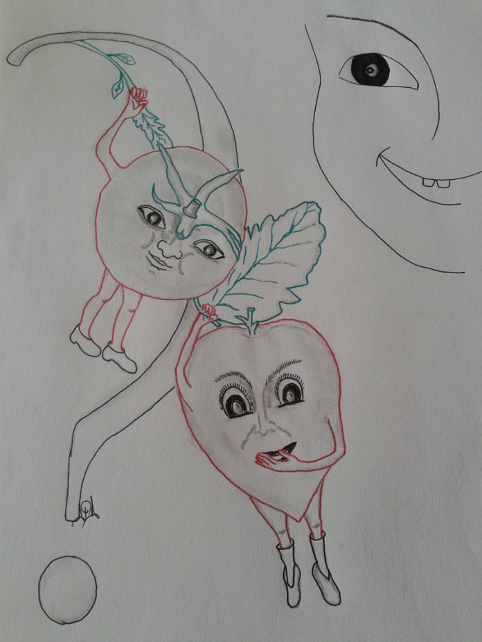 Zilele trecură una câte una… se făcură săptămâni… Roșiile răsădite și plantate scoaseră galbenă floare – cu moț prelung… Asemeni făcu și roșia singuratică… Florile lăsară loc micuțelor fructe, care creșteau… Vremea capricioasă oferi grădinii când perioade fierbinți, când zile reci cu ploi abundente… Un rând întreg cu roșii răsădite suferea: fructele care dăduseră-n pârg se crăpară, iar frunzele plantelor se ondulară… Roșioara din umbra casei avea frunze verzi și fructe perfecte… De ce oare? Domnul Iancu se consultă cu vecinii… Mădălin ascultă și el, cu atenție: „Vedeți dumneavoastră, domnu’ Iancu, roșiile răsădite au rădăcinile ramificate, ca ramurile copacilor, și pătrund mai puțin în pământ… Roșia de lângă casă, norocoasa care a apărut direct, are o rădăcină pivotantă, ca un morcov, care merge mult mai mult în adâncime – și astfel rezistă mai bine la secetă… Noi am avut când secetă, când ploaie și frig… Fructul de roșie a avut de suferit: când expus direct la căldura solară, când răcit puternic, în zilele ploioase cu valori termice scăzute… Pielița roșiilor ,,inima de bou” e subțire… sunt cărnoase și mari și predispuse la fisuri…” Între timp, roșioara cu noroc cocea de zor, cu soarele-împreună, mândrețe de fructe sferice… Și sosi vremea: Mădălin gustă prima roșie… fructul era mic, bucălat, cu gust acrișor și aromat… Fructele roșiilor răsădite erau tot atât de bune, poate mai puțin suculente și mai ,,cărnoase”… „Spune-ne, Mădălin, care plăntuță a câștigat concursul: una dintre cele puse de noi sau cea răsărită pe cont propriu?”, întrebă, zâmbind, domnul Iancu… „Tati, nu mă pot hotărî, fructele lor sunt la fel de bune…. ce pot spune sigur e că mai vreau!”, răspunse, cu gura plină și ochi surâzători, Mădălin… Domnul Iancu gustă la rându-i câte o roșie: copilul avusese dreptate… Erau foarte gustoase și aveau fiecare specificul ei… Glăsui: „Așa e: fiecare dintre concurente a dat tot ce a putut! Și totuși, e o diferență: la roșiile plantate de noi, gustul cel bun e dat de soiul roșiei, de soare, dar și de munca noastră, de eforturile pe care le-am făcut cu toții pentru a avea asemenea bunătăți pe masă! La roșioara norocoasă, gustul cel bun a venit de la soi, soare și de la dorința ei de a reuși! Noi suntem mulțumiți că știm mai multe azi decât ieri, că ne putem bucura de roșii gustoase și că munca noastră a fost răsplătită!“