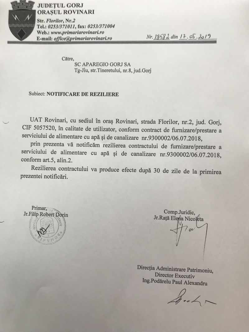 Primăria Rovinari a decis să renunțe la serviciile pe care operatorul județean de apă și canal, Aparegio SA, le presta pe raza orașului, decizia fiind luată după ce societatea a anunțat că, de luna viitoare, va cere bani pentru apa de ploaie care intră în rețelele de canalizare. Vestea i-a nemulțumit pe edilii tuturor orașelor în care Aparegio are activitate, scandalul cu Marcel Romanescu de la Târgu-Jiu fiind deja de notorietate. Robert Filip a mers însă mai departe și a decis să anunțe operatorul că în 30 de zile de la primirea notificării Primăria Rovinari încetează colaborarea cu Aparegio. Edilul e supărat că serviciile pentru care i se cer bani nu sunt de calitate și, atunci, preferă să le preia în administrare proprie pentru a le face mai bune.„Când am acceptat colaborarea cu ei am făcut-o pentru că ne-au spus că au nevoie de ajutorul nostru pentru că altfel pierdeau niște fonduri europene. Am fost de acord pentru că am sperat la servicii mai bune, dar nu a fost așa. Să vedeți ce calitate are apa de la robinet!