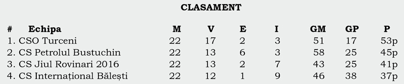Miercuri, 1 iunie, a avut loc runda a patra din play-off-ul fotbalului județean. Echipele angrenate în competiție au oferit meciuri antrenante spectatorilor care au decis să facă un drum până la stadion. În ambele partide s-au înscris câte șase goluri. Jiul Rovinari și-a luat o mică revanșă în fața campioanei CSO Turceni, după ce oaspeții a reușit să îi ,,fure” Cupa României, duminică. La Bustuchin, petroliștii nu au avut milă de Internațional, gazdele marcând de cinci ori pentru a-și consolida locul pe podium.