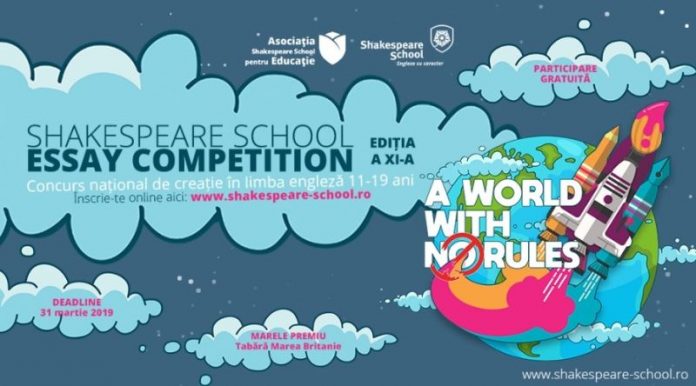 Shakespeare School Essay Competition a dat startul înscrierilor pentru cea de-a XI-a ediţie a Concursului naţional de eseuri în limba engleză, dedicat elevilor de gimnaziu şi liceu din toată ţara. Termenul limită de înscriere în concurs este 31 martie. Pentru ediţia din acest an, tema concursului este un eseu original în limba engleză cu titlul “A World with NO Rules” (“O lume fără reguli”).