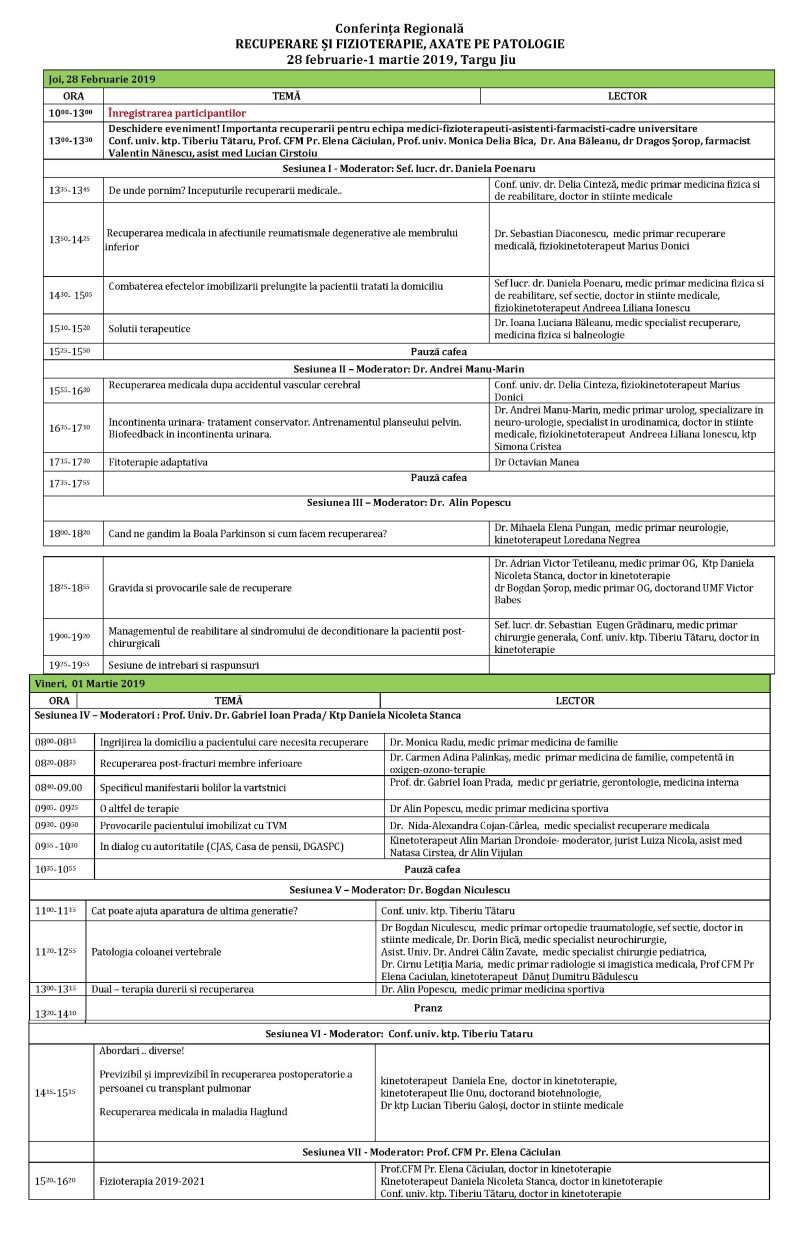 La Târgu-Jiu, în perioada 28 februarie-1 martie 2019, sunt așteptați să participe la Conferința Regională “Recuperare și fizioterapie, axate pe patologie”, toți cei implicați direct în activitatea de recuperare, dar și cei care pot colabora cu acești experți în domeniu.