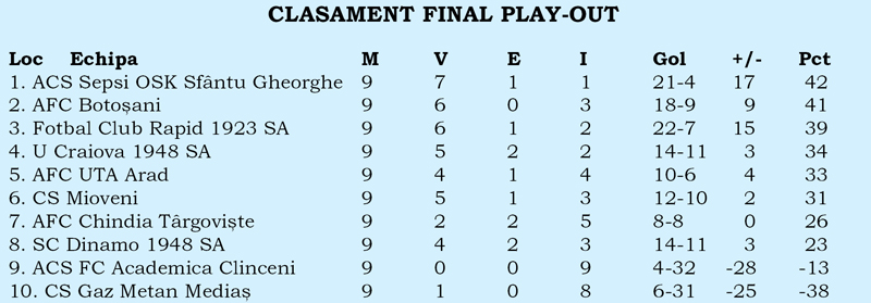 Sepsi OSK și FC Botoșani sunt echipele care se vor duela pentru barajul Conference League. Covăsnenii au câștigat categoric disputa din Bănie cu FCU, iar echipa lui Marius Croitoru a obținut un succes firesc la Clinceni. Marea perdantă a play-out-ului, dintre echipele fruntașe, este Rapid București. Giuleștenii au bifat două înfrângeri consecutive și au căzut pe locul trei. Ar mai avea totuși o șansă la baraj dacă echipa lui Cristiano Bergodi va câștiga prima cupă a României din istoria clubului. Joi, 19 mai, de la ora 20.30, Sepsi se duelează pentru trofeu cu FC Voluntari. Ca de obicei, într-un fotbal în care sistemele competiționale se schimbă frecvent, orice decizie va părea controversată. Câștigătoarea barajului din play-out va juca în Bănie cu Universitatea Craiova, într-un meci decisiv pentru a stabili ultima echipă care va merge în preliminariile Conference League. ,,Îmi doream să câștigăm play-out-ul, pentru mine și pentru echipă, apoi era barajul. Ce s-a întâmplat e de noaptea minții. Nu e posibil să dai gol și să iei după 30 de secunde. Nu am apucat să respir că am și luat gol. E o atitudine din cauza căreia nu merităm Europa. Nu putem să primim gol cu atâta lejeritate după ce marcăm. Mioveni a avut trei șuturi și a dat trei goluri. O echipă care vrea să intre în play-off și să fie în Europa trebuie să fie mult mai matură”, a declarat antrenorul Rapidului, Adrian Mutu, după înfrângerea cu argeșenii.