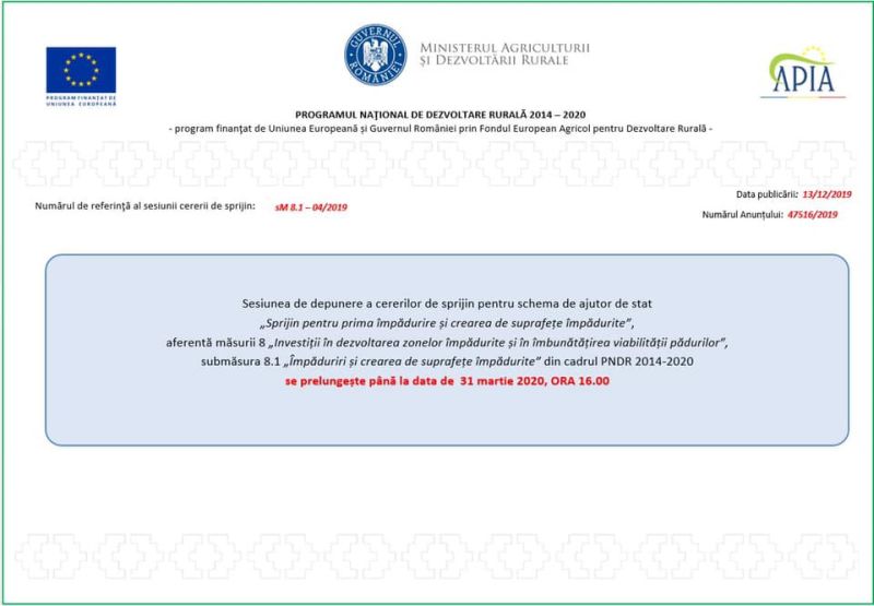 Agenția de Plăți și Intervenție pentru Agricultură (APIA) informează potențialii beneficiari că s-a prelungit cea de a 4-a sesiune de depunere a cererilor de sprijin pentru Schema de ajutor de stat „Sprijin pentru prima împădurire și crearea de suprafețe împădurite”, aferentă Măsurii 8 „Investiții în dezvoltarea zonelor împădurite și îmbunătățirea viabilității pădurilor”, submăsura 8.1 „Împăduriri și crearea de suprafețe împădurite”, din cadrul Programului Național de Dezvoltare Rurală 2014-2020, până la data de 31 martie 2020 (inclusiv), ora 16.00. Astfel, prelungirea termenului de depunere a cererilor de sprijin asigură condițiile necesare pentru accesarea submăsurii 8.1 pentru care există un interes real, accesarea fondurilor FEADR aferente având impact pozitiv pentru atingerea obiectivelor PNDR 2014-2020. Alocarea financiară pentru sesiunea 4/2019 este de 15.000.000 euro. Beneficiarii schemei sunt deţinătorii publici şi privaţi de teren agricol şi neagricol şi formele asociative ale acestora. În categoria deţinătorilor publici de teren agricol şi neagricol sunt incluse unităţile administrativ teritoriale de nivel LAU 2 (comune, oraşe, municipii) şi alte persoane juridice de drept public, precum şi formele asociative ale acestora. În categoria deţinătorilor privaţi de teren agricol şi neagricol sunt incluse persoanele fizice, persoanele fizice autorizate, întreprinderile individuale, între-prinderile familiale, societăţile comerciale, asociaţiile şi fundaţiile, alte persoane juridice de drept privat, precum şi formele asociative ale acestora. Suprafaţa terenului propus pentru împădurire, în cazul realizării de perdele forestiere de protecţie, trebuie să fie de cel puţin 0,5 ha, iar suprafaţa compactă minimă împădurită de cel puţin 0,1 ha. Suprafaţa terenului propus pentru împădurire, în cazul realizării de trupuri de pădure, trebuie să fie de cel puţin 1 ha, iar suprafaţa compactă minimă împădurită de cel puţin 0,5 ha.