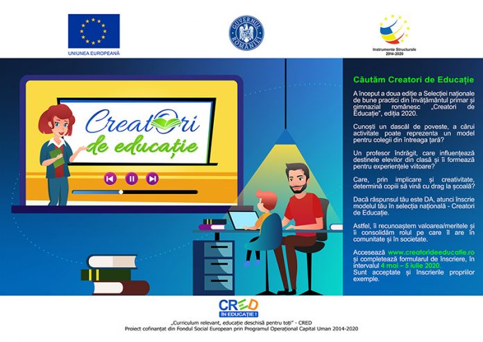 Selecția Națională ,,Creatori de Educație” este singura competiție dedicată exclusiv cadrelor didactice care folosesc metode și strategii didactice interactive/inovatoare, care aplică în mod creativ programele școlare la nivel primar/gimnazial, care generează schimbare/progres școlar la nivelul claselor de elevi cu care lucrează și care își adaptează demersul didactic, în mod inventiv, la nevoile și interesele elevilor. Nu în ultimul rând, în cadrul selecției se pune accent pe actul pedagogic din comunitățile dezavantajate, pe prevenirea sau reducerea absenteismului sau abandonului școlar, pe creșterea șanselor elevilor de continuare a studiilor în niveluri superioare de educație și crearea unui spațiu educațional incluziv. Activitățile cadrelor didactice pot fi înscrise prin intermediul platformei online dedicate, creatorideeducatie.ro, până pe 5 iulie 2020. Înscrierile pot fi făcute de elevi, părinți sau colegi din sistemul de învățământ, reprezentanți ai societății civile etc. De asemenea, cadrele didactice își pot înregistra singure activitățile în selecție. Selecția a fost lansată în luna mai, iar termenul inițial de înscriere era 19 iunie 2020. ,,În luna mai 2020, în cadrul proiectului nostru, „Curriculum Relevant, Educație Deschisă pentru toți” – CRED, am lansat a doua ediție a Selecției Naționale de bune practici „Creatori de Educație”. Pentru a oferi cât mai multor cadre didactice oportunitatea de a evidenția activitățile originale sau soluțiile inovatoare aplicate la clasă, în contextul în care selecția din acest an se desfășoară în condiții speciale ce presupun, pentru dascăli, un volum foarte mare de muncă, am decis să prelungim perioada de înscriere, până la data de 5 iulie 2020. La nivelul întregii țări, avem astfel de profesori valoroși, care – prin activitatea desfășurată atât la clasă, cât și în „Școala de acasă” – contribuie la starea de bine a copiilor României, ajutându-i totodată să își descopere potențialul maxim. Dascăli care merită să fie recunoscuți (și premiați) drept veritabili „Creatori de Educație”. De aceea, ne face o mare bucurie să vă invităm, stimați colegi, să vă implicați în procesul de recomandare a modelelor de bună practică educațională și să faceți propuneri concrete pe site-ul selecției, www.creatorideeducatie.ro, contribuind astfel la promovarea exemplelor pedagogice inspiraționale, fie ele din Comunitatea CRED sau din afara acesteia”, au anunțat organizatorii. Potrivit noului calendar de derulare a competiției, validarea online a condițiilor de eligibilitate a propunerilor înscrise se va face în perioada 6 – 31 iulie, urmând ca selecția modelelor de bune practici să se desfășoare în perioada 1 – 31 august.