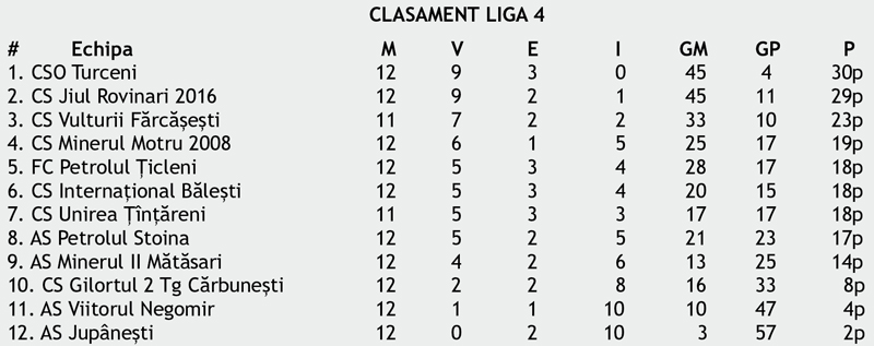 A revenit Liga 4 din Gorj. Vremea frumoasă de la finalul săptămânii a fost ideală pentru desfășurarea etapei a 14-a la județ. S-a marcat pe toate cele cinci stadioane care au găzduit confruntări. Liderul CSO Turceni a fost ținut în șah la Bălești. De pasul greșit a profitat principala contracandidată la titlu, Jiul Rovinari. Băieții lui Ion Lițoiu s-au impus în deplasarea de la Jupânești. Cel mai clar succes a fost obținut de Viitorul Negomir. Liga 5 se reia la sfârșitul acestei săptămâni.