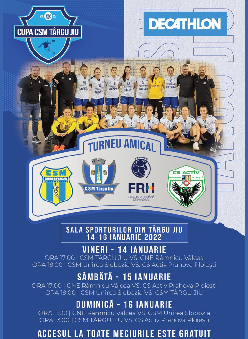 Una dintre echipele invitate de CSM Târgu Jiu la turneul amical de la sfârșitul acestei săptămâni nu se va mai prezenta la competiția de pregătire. Este vorba despre CSM București 2, nevoită să se retragă de la întrecerea din Sala Sporturilor din cauza cazurilor de COVID-19 înregistrate la nivelul lotului. În locul echipei bucureștene la turneul amical din orașul lui Brâncuși va ajunge ,,vecina” CNE Râmnicu Vâlcea. Meciurile se vor disputa în perioada 14-16 ianuarie, iar accesul spectatorilor la toate partidele din cadrul turneului este gratuit, dar se va face în anumite condiții. Sala va fi umplută doar la 50% din capacitate, iar participarea este permisă doar pentru: persoanele vaccinate împotriva virusului SARS-CoV-2 și pentru care au trecut 10 zile de la finalizarea schemei complete de vaccinare ; persoanele care se află în perioada cuprinsă între a 15-a zi și a 180-a zi ulterioară confirmării infectării cu virusul SARS-CoV-2, persoanele care prezintă rezultatul negativ al unui test RT-PCR pentru infecția cu virusul SARSCoV-2 nu mai vechi de 72 de ore sau al unui test antigen rapid pentru infecția cu virusul SARSCoV-2 nu mai vechi de 48 de ore. ,,Un turneu foarte puternic, la care participă echipe cu tradiție în handbal. Vor fi trei jocuri foarte puternice în care urmărim diferite formule de joc și pregătim returul de campionat. Este ultimul test pentru a ne da seama unde sunt fetele, dar și pentru a vedea unde mai trebuie să lucrăm. Îi așteptăm pe spectatori să vină să ne susțină. Pe plan sportiv, secția de handbal are același obiectiv principal, de a atrage către sport cât mai mulți copii din județul nostru. În același timp, îmi doresc pentru 2022 să reușim o promovare istorică în Liga Florilor cu echipa care acum este pe podiumul din Seria B a Diviziei A. Pot spune cu certitudine că suntem în grafic cu echipa de senioare până la această dată, ținând cont de rezultatele favorabile nouă, echipa reușind să se impună în toate jocurile disputate. Urmează partea a doua a campionatului, cu noi provocări, dar eu am încredere în echipă și cred că fetele noastre pot câștiga seria dacă toate lucrurile merg pe făgașul normal”, a declarat expertul sportiv Dan Ilieș pentru csmtargujiu.ro. Programul competiției amicale de la Târgu-Jiu a fost definitivat.