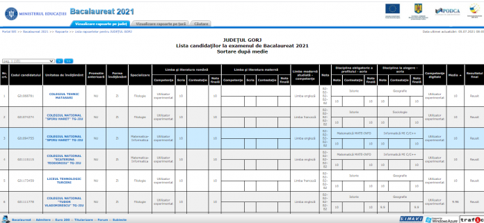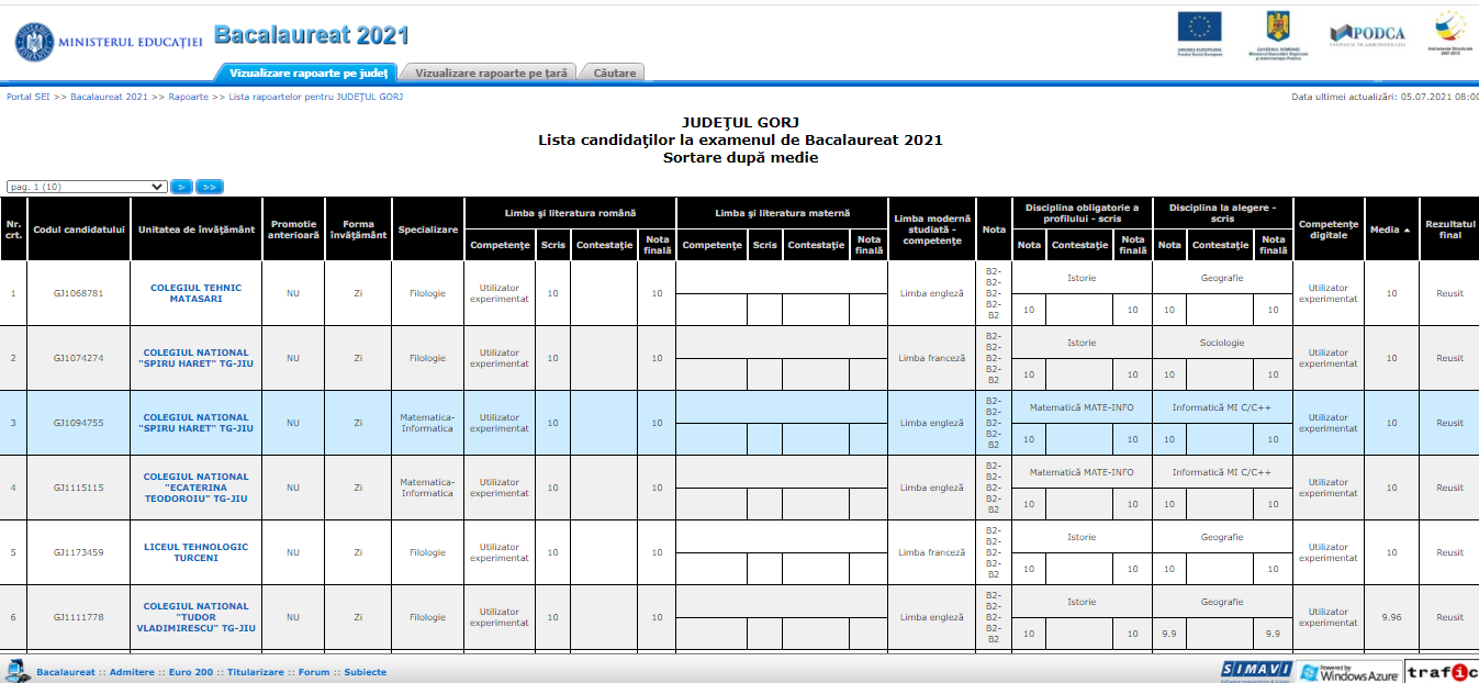 Primele rezultate ale examenului de Bacalaureat, înainte de contestații, au fost afișate în această dimineață. În Gorj, cinci dintre candidați au promovat examenul cu media 10. Este vorba de un candidat de la Colegiul Tehnic Mătăsari, doi de la Colegiul Național ”Spiru Haret” Târgu-Jiu, unul de la Colegiul Național ”Ecaterina Teodoroiu” Târgu-Jiu și unul de la Liceul Tehnologic Turceni. 1774 de candidați au obținut cel puțin media 6.