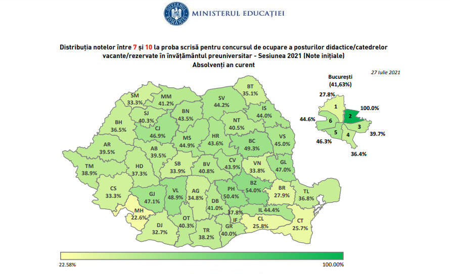 Rezultatele obținute de cadrele didactice care au susținut proba scrisă din cadrul concursului pentru ocuparea posturilor didactice din învățământul preuniversitar – sesiunea 2021 (înainte de înregistrarea contestațiilor) au fost publicate astăzi, 27 iulie, ora 10:00, pe pagina web dedicată, titularizare.edu.ro. Potrivit datelor publicate de Ministerul Educației, la nivelul județului Gorj s-au înregistrat 147 de note între 7 și 9,99 și 133 de note între 5 și 6,99. Doi candidați au promovat proba scrisă cu nota 10. S-au mai înregistrat 74 de note cuprinse între 1,01 și 4,99. Pentru angajarea pe perioadă nedeterminată (titularizare), candidații trebuie să obțină la proba scrisă minimum nota 7 (șapte), iar pentru angajarea pe perioadă determinată (suplinire), minimum nota 5 (cinci). Proba practică și inspecția la clasă au fost eliminate pentru anul în curs prin OUG nr. 70/2020, aprobată prin Legea nr. 179/2020, cu modificările şi completările ulterioare.