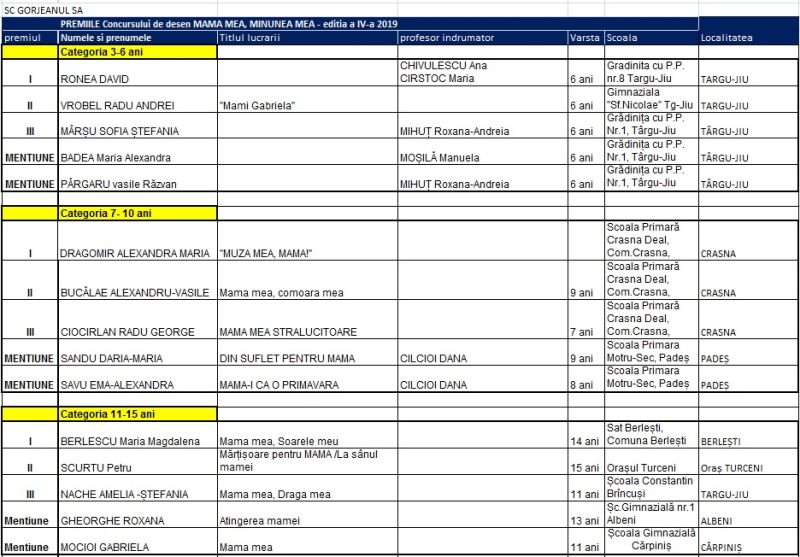 Ediția 2019 a concursului ,,MAMA mea, MINUNEA mea”, organizat de cotidianul Gorjeanul, a ajuns la final. Câștigătorii își vor putea ridica premiile începând din data de 8 martie de la secretariatul publicației(Centrul de publicitate, strada T.Vladimirescu, nr.17) din Târgu-Jiu, între orele 9.00-16.00, ori săptămâna viitoare, de luni până vineri între orele 8.00-16.00. În concurs au fost înscrise peste 300 de lucrări, de la elevi din trei județe din Oltenia.