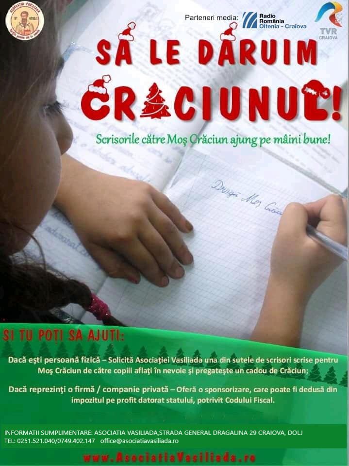 Asociaţia Vasiliada, aflată sub patronajul Mitropoliei Olteniei, a demarat campania umanitară „Să le dăruim Crăciunul!”, prin care doreşte să sensibilizeze comunitatea locală cu privire la situaţia materială precară în care se află sute de copii nevoiaşi din judeţele Dolj şi Gorj.