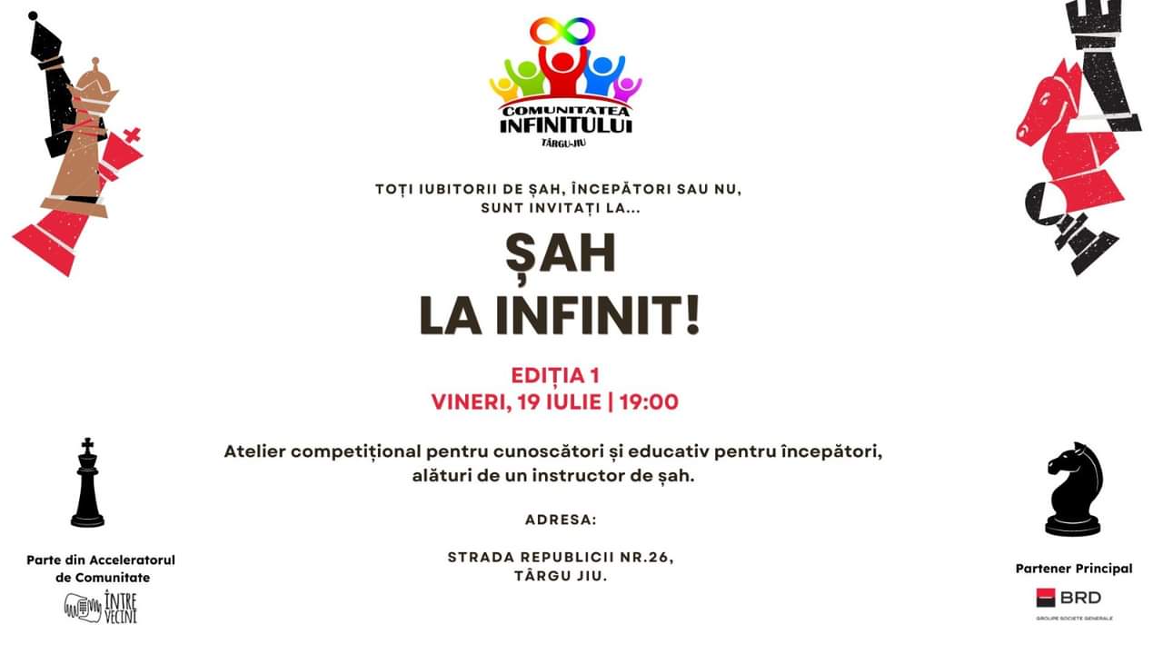 „Sărbătorim în avans Ziua Mondială a Șahului (20 iulie). Dacă iubești șahul te așteptăm să ne cunoaștem și să aprofundăm tainele jocului în comunitate. Noi punem la dispoziție totul…tu trebuie doar să spui „prezent”. Șahul permite consolidarea educaţiei, a egalităţii de gen, precum şi cea a incluziunii, a toleranţei, înţelegerii şi respectului reciproc”, au anunțat reprezentanții Comunității Infinitului Târgu Jiu.