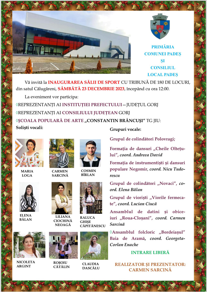 Sala de sport din comuna Padeș va fi inaugurată cu un spectacol de muzică populară. Evenimentul va avea loc pe data de 23 decembrie, începând cu ora 12.00. Maria Loga, Carmen Sarcină, Cosmin Bîrlan, Elena Bălan, Liliana Ciochină Neoagă, Raluca Ghișe Căpitănescu, Nicoleta Argint, Cătălin Roșoiu și Claudia Dascălu îi vor încânta pe localnici. Vor mai participa grupuri de colindători și formații de instrumentiști și dansuri populare. Sala de sport cu 180 de locuri a fost construită în satul Călugăreni. Este o investiție de peste 5 milioane de lei, finanțarea fiind asigurată de Compania Națională de Investiții.