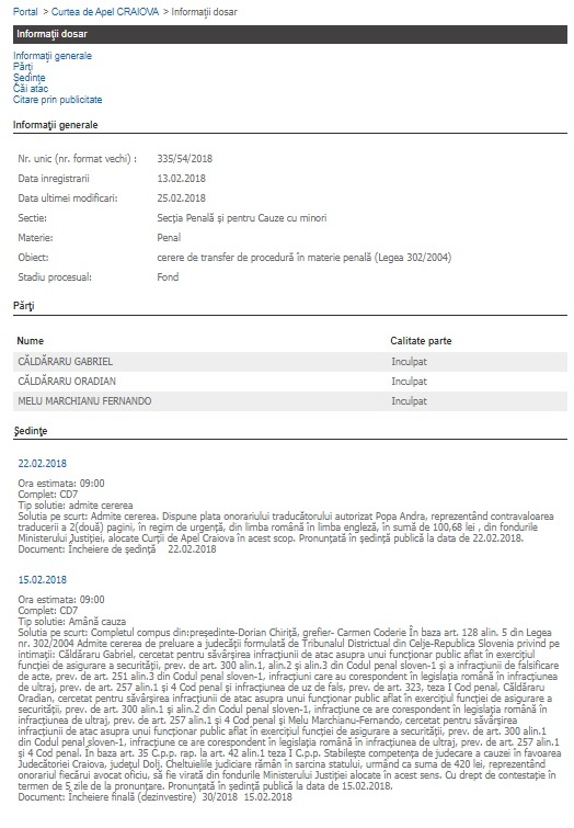 Mai exact, Căldăraru Oradian a fost cercetat pentru săvârşirea infracţiunii de atac asupra unui funcţionar public aflat în exerciţiul funcţiei de asigurare a securităţii, prev. de art. 300 alin.1 şi alin.2 din Codul penal sloven-1, infracţiune ce are corespondent în legislaţia română în infracţiunea de ultraj, prev. de art. 257 alin.1 şi 4 Cod penal şi trimis în judecată în această speță. Dosarul nr.335/54/2018 se află pe rolul Curții de Apel Craiova încă din 13 februarie 2018.
