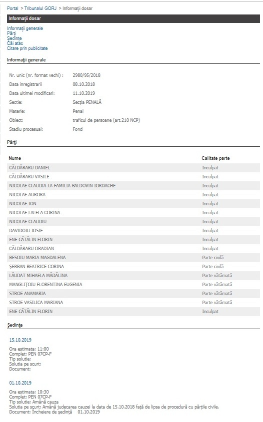 Dosarul s-a mutat între timp la Judecătoria Craiova. Termen în dosar este pe 1 noiembrie 2019. Al doilea dosar al consilierului Oradian Căldăraru se află însă la Tribunalul Gorj. În dosarul 2980/95/2018 inculpatul Căldăraru Oradian a fost trimis în judecată sub aspectul săvârșirii infracțiunilor de: constituirea unui grup infracțional organizat, trafic de minori în formă continuată (persoană vătămată Șerban Beatrice Corina) și trafic de persoane în formă continuată (cu privire la Lăudat Mihaela Mădălina).