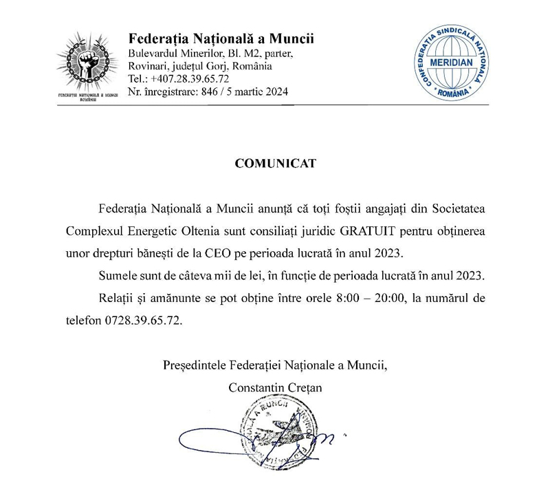 Președintele Federației Naționale a Munci, Constantin Crețan, a anunțat că angajații Complexului Energetic Oltenia care s-au pensionat anul trecut pot beneficia de consiliere gratuită, pentru obținerea în instanțele de judecată a drepturilor care rezultă din munca lor în anul 2023.