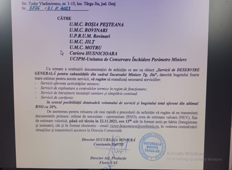 Mai mult, conform unei circulare date de șeful Sucursalei Miniere a companiei, Constantin David, toate UMC-urile (unități miniere de exploatare) trebuie să-și reducă drastic cheltuielile cu serviciile aferente activităților miniere. Mai precis, cu 20%, iar asta înseamnă că sunt foarte posibile concedieri la Minprest. Unitatea lucrează exclusiv pentru companie, dar cei aproximativ 1.000 de oameni au salarii de mizerie în comparație cu colegii lor din cariere sau termocentrale.