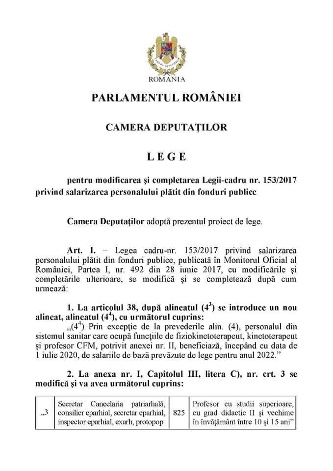 1. Dar s a mai comis o nedreptate. Kinetoterapeutii din asistenta sociala au fost uitati. Sunt cei care lucreaza in centrele rezidentiale.. Conform prevederilor Ordonantei 8… 14 zile non stop,departe de familie.. Asistentul medical, medicul, psihologul are aceiasi omincadrare indiferent ca lucreaza la spital sau in asistenta sociala…. Deci e o discriminare in cazul kinetoterapeutului. DOMNILOR PARLAMENTARI FACETI DREPTATE!!
