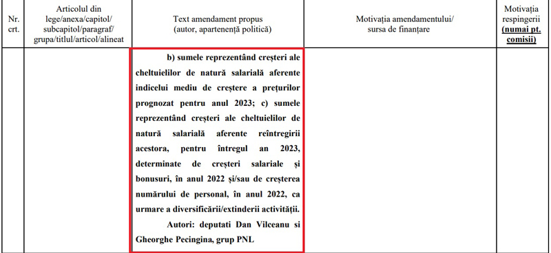Practic, amendamentul propus la Legea bugetului de stat pentru anul viitor a vizat faptul că, pentru determinarea câștigului mediu brut lunar pe salariat, în vederea stabilirii indicelui de creștere a acestuia să nu se ia în calcul sumele reprezentând creșteri ale cheltuielilor de natură salarială aferente indicelui mediu de creștere a prețurilor prognozat pentru anul 2023, respectivele sume reprezentând creșteri ale cheltuielilor de natură salarială aferente reîntregirii acestora, pentru întregul an 2023, determinate de creșteri salariale și bonusuri, în anul 2022 și/sau de creșterea numărului de personal, în anul 2022, ca urmare a diversificării/extinderii activității.