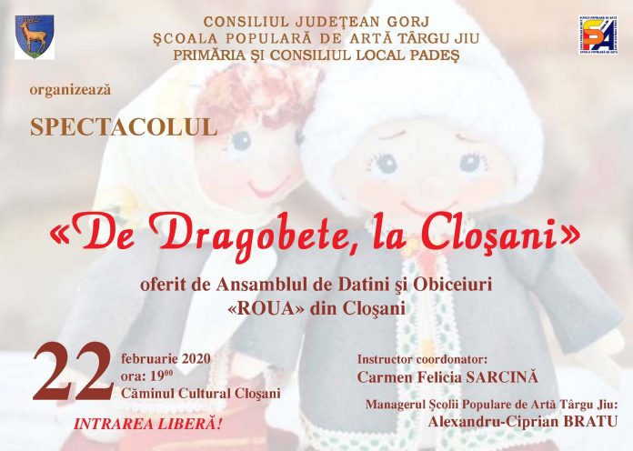 Școala Populară de Artă Târgu Jiu, instituție subordonată Consiliului Județean Gorj, alături de Primăria si Consiliul Local Padeș, organizează sâmbătă, 22 februarie 2020, ora 19:00, evenimentul cultural ”De Dragobete, la Cloșani”, manifestare dedicată Zilei de Dragobete, sărbătoarea iubirii la români. Ansamblul de datini și obiceiuri ”Roua” din Cloșani, coordonat de prof. Carmen Felicia Sarcină, a pregătit, pentru publicul prezent, o salbă de cântece de mare vechime și originalitate.
