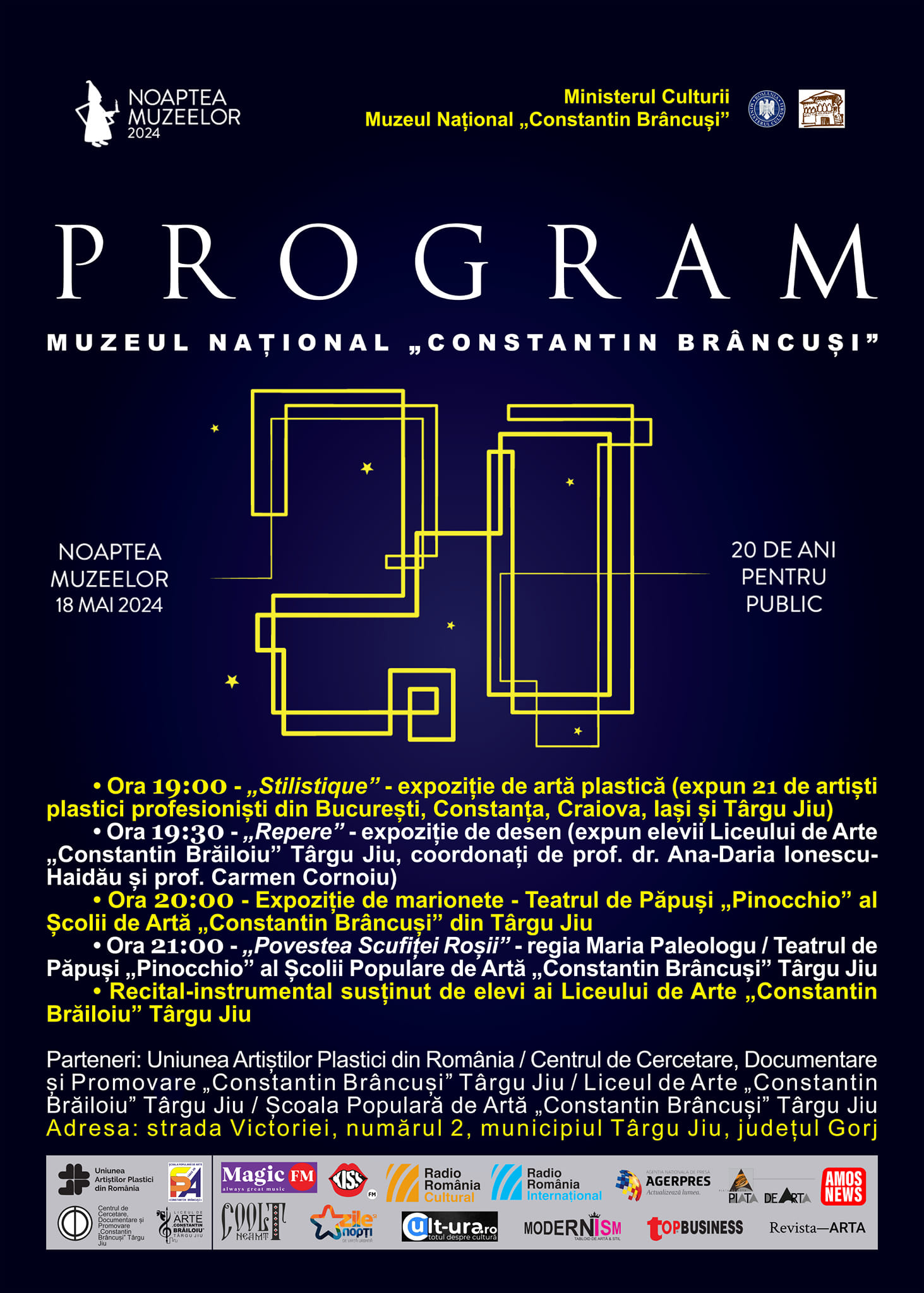 ”Muzeul Național ”Constantin Brâncuși” va rămâne deschis publicului până la ora 01:00. Pe parcursul desfășurării evenimentelor vor fi susținute recitaluri instrumentale de către elevi ai Liceului de Arte ”Constantin Brăiloiu”. Vă așteptăm cu drag!”, a anunțat conducerea Muzeului Național ”Constantin Brâncuși” Târgu Jiu.