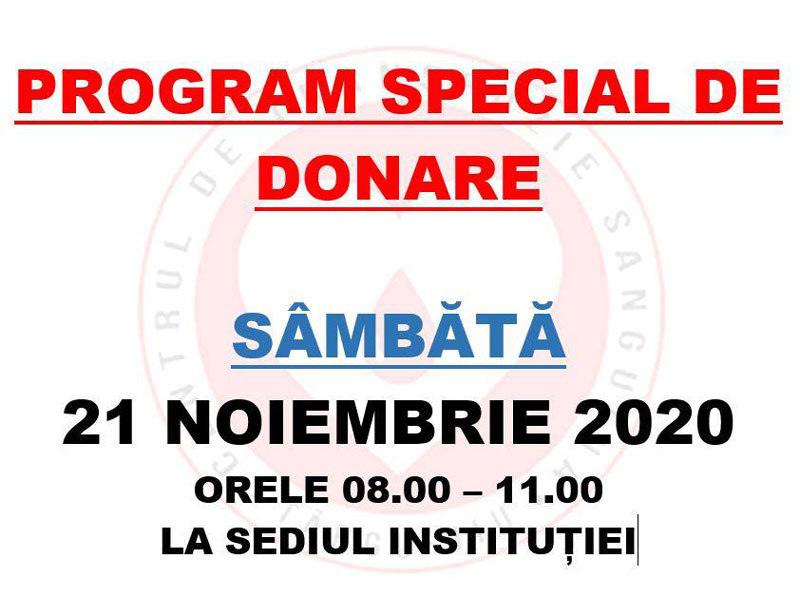 Sâmbătă, Centrul de Transfuzie Sanguină organizează un nou program special de donare de sânge! Astfel, Centrul de Transfuzie Sanguină din municipiul Târgu-Jiu îi așteaptă pe 21 noiembrie 2020, între orele 08.00-11.00, pe toți cei care doresc să doneze sânge, însă programul de lucru din timpul săptămânii nu le-a permis să doneze. „Donează sânge, fii generos! Sângele este o resursă naţională; donarea de sânge este un act voluntar, anonim şi neremunerat. Sâmbătă, 21 noiembrie 2020, îi așteptăm pe toți cei care doresc să doneze sânge, la sediul nostru, între orele 08.00-11.00, mai ales pe cei pe care programul încărcat de lucru din timpul săptămânii i-a împiedicat să doneze”, au transmis organizatorii.