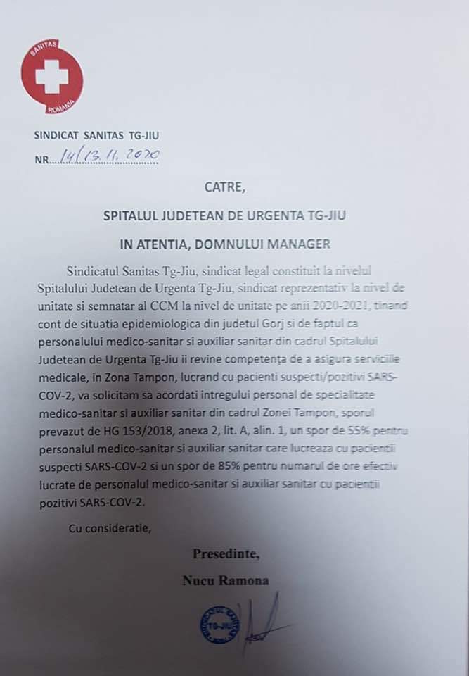 Sanitas solicită acordarea unor sporuri pentru personalul din zona „tampon” a SJU Târgu Jiu