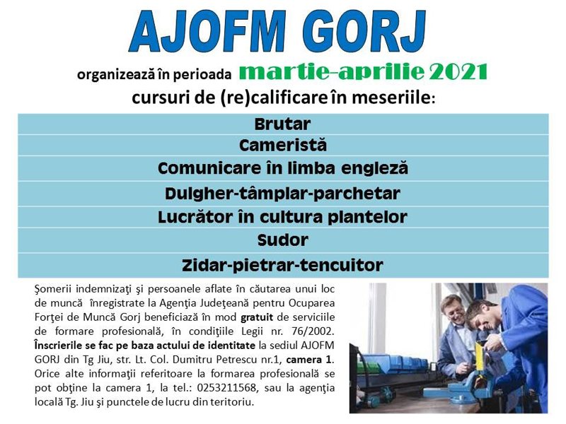 Pentru lunile martie-aprilie, Agenţia Judeţeană pentru Ocuparea Forţei de Muncă Gorj organizează șapte cursuri de formare profesională, și anume: brutar, cameristă, comunicare în limba engleză, dulgher – tâmplar – parchetar, lucrător în cultura plantelor, sudor, zidar – pietrar – tencuitor. Gorjenii care beneficiază de indemnizație de șomaj sunt obligați să participe la programele de formare profesională oferite şi organizate de AJOFM. Persoanele îndreptăţite pot beneficia de servicii de formare profesională gratuite, o singură dată, pentru fiecare perioadă în care se află în căutarea unui loc de muncă. Înscrierile pentru cursurile de calificare, precum şi orice alte informaţii referitoare la formarea profesională se pot obţine de la sediul AJOFM GORJ din Târgu-Jiu, str. Lt. Col. Dumitru Petrescu, nr. 1, sau de la agenţiile locale şi punctele de lucru din teritoriu. De asemenea, pe parcursul acestei luni, Agenţia Naţională pentru Ocuparea Forţei de Muncă organizează un număr de 103 programe de formare profesională pentru 1.651 de persoane care beneficiază, conform legii, de servicii de formare profesională gratuite. Acestea vor fi organizate de agențiile județene pentru ocuparea forţei de muncă şi de Agenţia Municipală pentru Ocuparea Forţei de Muncă Bucureşti. Pentru detalii, cei interesaţi se pot adresa agenţiei teritoriale pentru ocuparea forţei de muncă în a cărei rază au domiciliul sau reşedinţa sau pot vizualiza oferta de cursuri pe www.anofm.ro, la secţiunea ,,Persoane fizice/Cursuri de formare profesională”.
