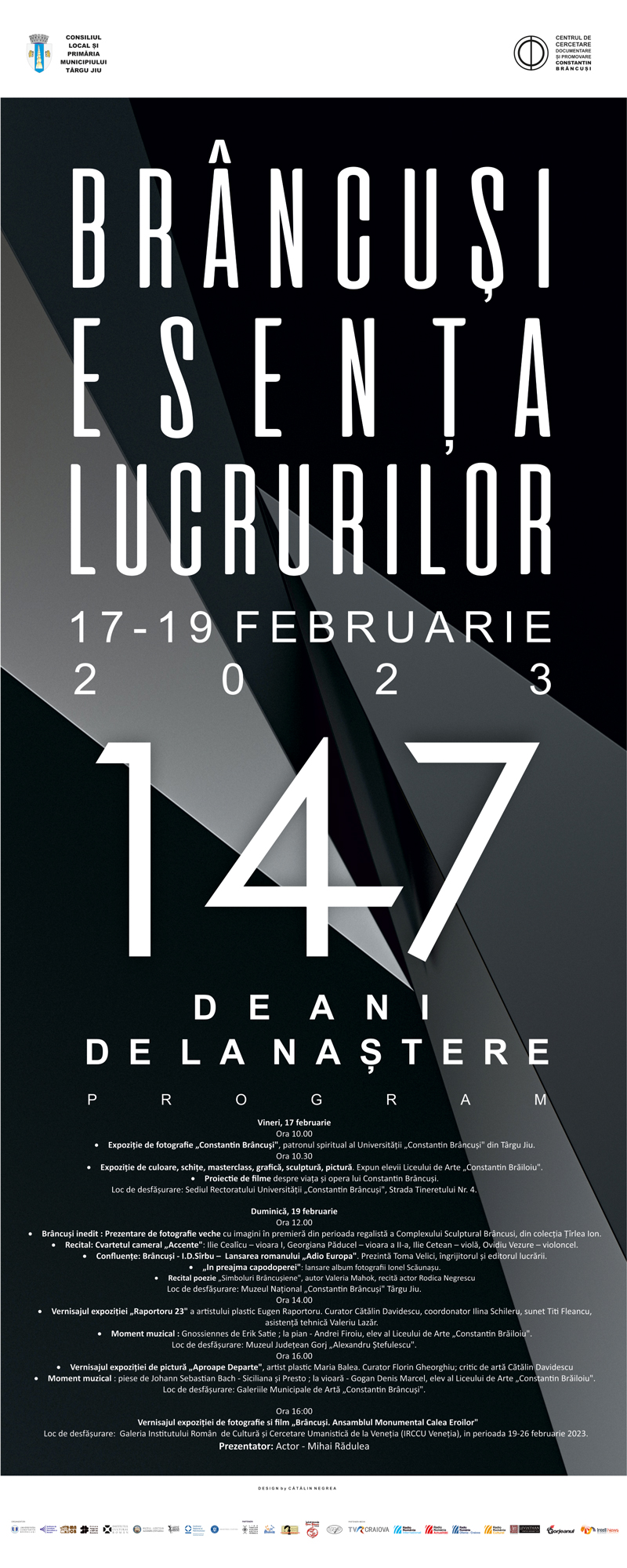 Împlinirea a 147 de ani de la nașterea genialului și încă prea puțin înțelesului Constantin Brâncuși va fi sărbătorită la Târgu-Jiu, în zilele de 17 și 19 februarie, printr-un lăudabil efort comun al instituțiilor de cultură și al mediului universitar, implicate în promovarea acestui unic fiu al Gorjului. Manifestările încep vineri, 17 februarie, cu două expoziții interesante, organizate la sediul Rectoratului Universității „Constantin Brâncuși”. Prima expoziție cuprinde momente din timpul turnării modulelor Coloanei fără Sfârșit la Atelierele Centrale din Petroșani și a montării lor la Târgu-Jiu, între august și septembrie 1937. Imaginile cu Coloana au fost executate de inginerul Ștefan Georgescu-Gorjan, realizatorul tehnic al monumentului, precum și de alți membri ai echipei de montaj. În prezent, aceste fotografii fac parte din arhiva Gorjan. O a doua expoziție cuprinde lucrări de pictură, grafică, sculptură și schițe ale elevilor Liceului de Arte „Constantin Brăiloiu” din municipiu. Tot în același spațiu se va derula și o proiecție de filme despre viața și opera lui Constantin Brâncuși, patronul spiritual al universității târgujiene.