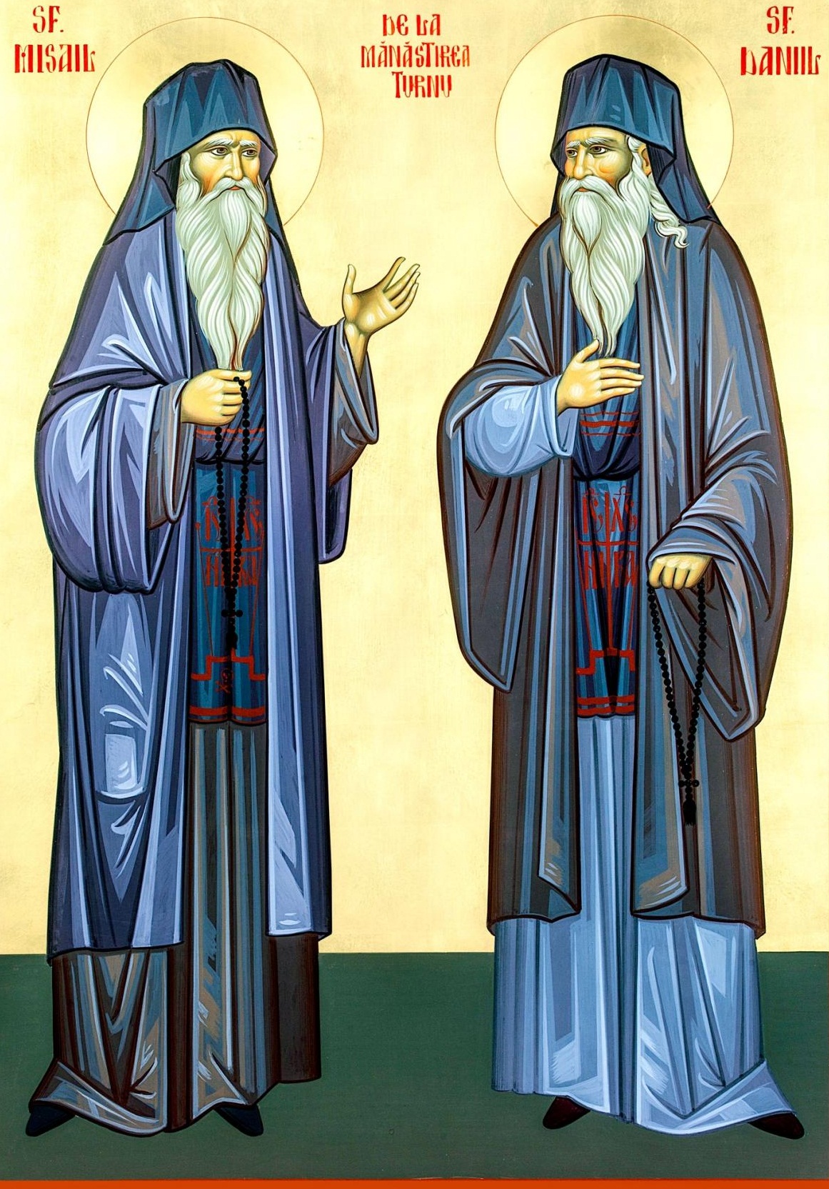Astăzi, 5 octombrie, îi sărbătorim cu evlavie şi cu adâncă preţuire duhovnicească pe Sfinții Cuvioși Daniil și Misail de la Mănăstirea Turnu – Vâlcea, ştiut fiind faptul că amândoi, încă din tinerețile lor, erau iubitori de nevoințe pentru Dumnezeu și doritori de o viață în sfinţenie, având aplecare şi dragoste către Mântuitorul Iisus Hristos și către Preacurata Sa Maică, având în sufletul lor şi în mintea luminată porunca cea sfântă a Domnului: „Cel ce voiește să vină după Mine să se lepede de sine să-și ia crucea sa și să-Mi urmeze Mie”, motiv pentru care cei doi au lăsat casă, părinți, frați, rude și prieteni, și au intrat în Mănăstirea Cozia ca frați întru vieţuire monahală, viețuind în ascultare și smerenie, urmând pe Fiul lui Dumnezeu, Cel ce S-a făcut ascultător Tatălui pentru noi, până la moartea Sa pe cruce. Sfinții Cuvioși Daniil și Misail au deprins taina nevoințelor, dobândind darul rugăciunii și al iubirii de Dumnezeu pentru a se primeni sufletul şi inima de apăsările unei lumi păcătoase! Deci, parcurgând după rânduială, toate încercările duhovnicești, Sfinții Cuvioși Daniil și Misail s-au supus poruncilor starețului lor și ale fraților, fiind exemple vii de nevoință întru toate cele lumeşti şi duhovniceşti. Nu mult după ce au intrat în mănăstire, pentru multele lor osteneli și pentru râvna lor smerită şi desăvârşită după Dumnezeu, s-au făcut vrednici de mult dorita vieţuire a călugăriei, primind tunderea de la egumenul lor. Astfel, Cuviosul Daniil, fiind cunoscător al Sfintelor Scripturi și al învățăturilor Sfinților Părinți, dar având și o viață vrednică și cu multă iscusință în viața călugărească, a fost învrednicit de harul preoției. Deci, ajuns ca făclia în sfeșnic şi arzând întru credinţă, prin viață smerită și curată, s-a făcut repede cunoscut de către părinții din mănăstire, care și l-au ales printr-o taină desăvârşită ca duhovnic și povățuitor pe calea mântuirii. Printre cei care se mărturiseau la cuviosul Daniil a fost și vrednicul de pomenire fericitul Misail, care i-a devenit și ucenic duhovnicesc. Primind ascultarea de duhovnic, Sfântul Daniil a început și mai cu osârdie a se nevoi, mergând din putere în putere și sporind întru faptele cele bune, chip și pildă sfinţitoare făcându-se tuturor. După o vreme, dorind împlinire duhovnicească și arzând de dragostea cea dumnezeiască, au hotărât împreună să părăsească viața de obște și să meargă în pustnicie. Primind binecuvântare de la starețul lor, au mers dincolo de Turnul lui Traian, în ținuturile Muntelui Cozia, unde și-au săpat chilii în stânca muntelui lângă izvoarele de apă ale pădurii liniștite, cu toate că deseori, multe au fost ispitele Cuvioșilor, însă, nici una n-a biruit setea lor de rugăciune, de liniște și de osteneli întru credinţă. Sub acoperământul Maicii Domnului, în jurul Cuvioșilor s-a adunat o mică obște de frați nevoitori întru rugăciunea neîncetată, în privegheri, post și în citirea cărților folositoare de suflet, ceea ce a însemnat o recunoaştere a vieţii lor sfinte! De aceea, fericiții