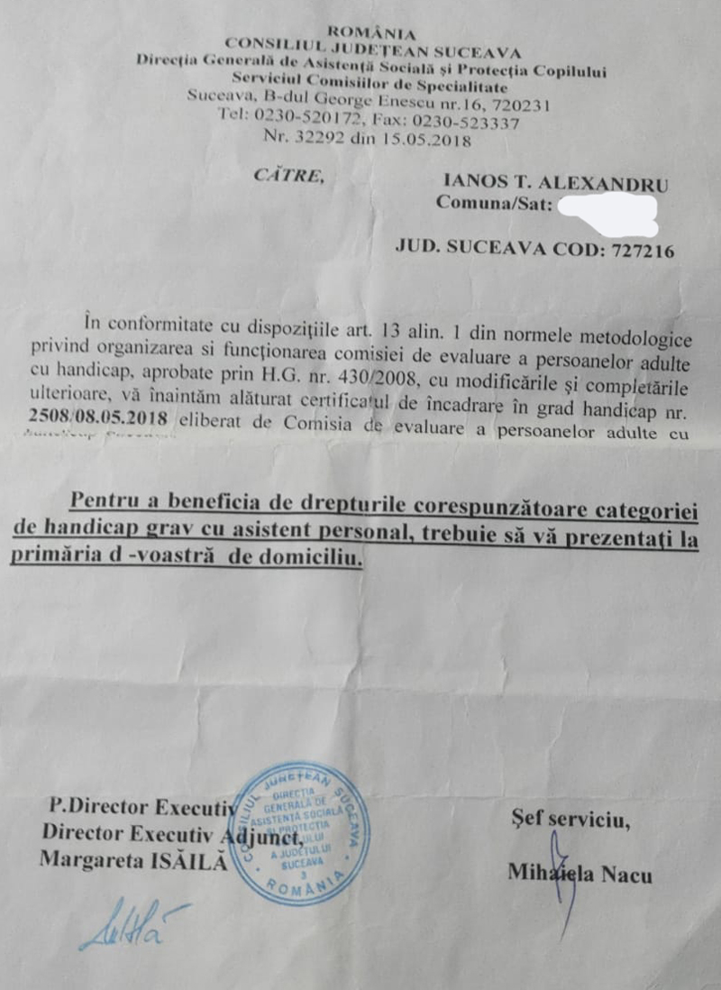 Ulterior a fost încadrat în gradul întâi de handicap cu însoțitor.